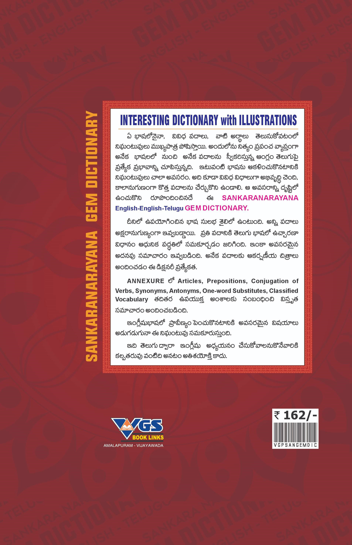 Sankaranarayana Abridge Gem Dictionary this trilingual dictionary guide provides meanings in Both English and Telugu, Utilizing a simple language style to make it accessible for all types of learners. It features helpful illusrations to enhance language proficiency.