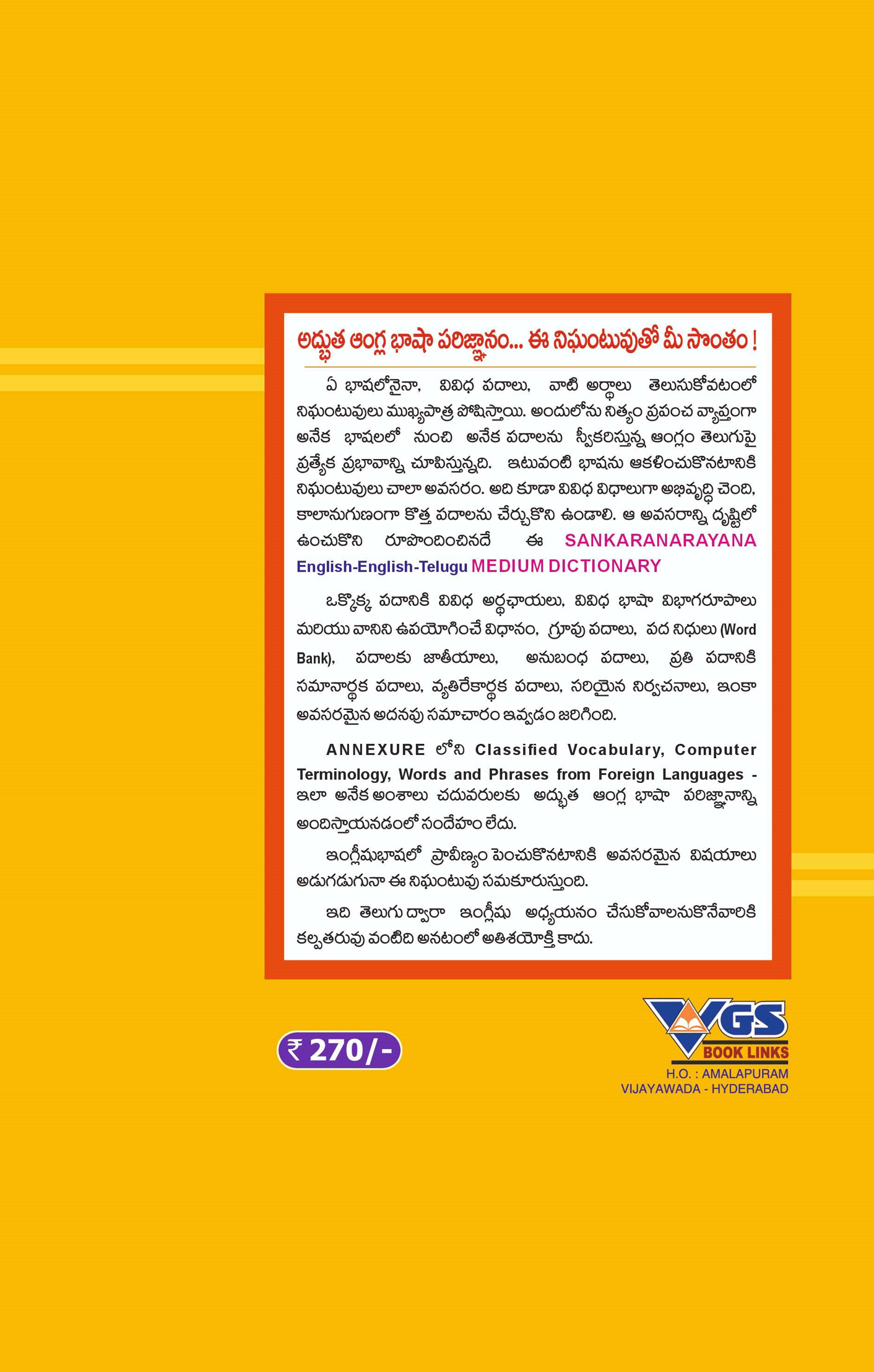 Sankaranarayana Medium Dictionary is a English-English-Telugu with telugu Prounciation Book.