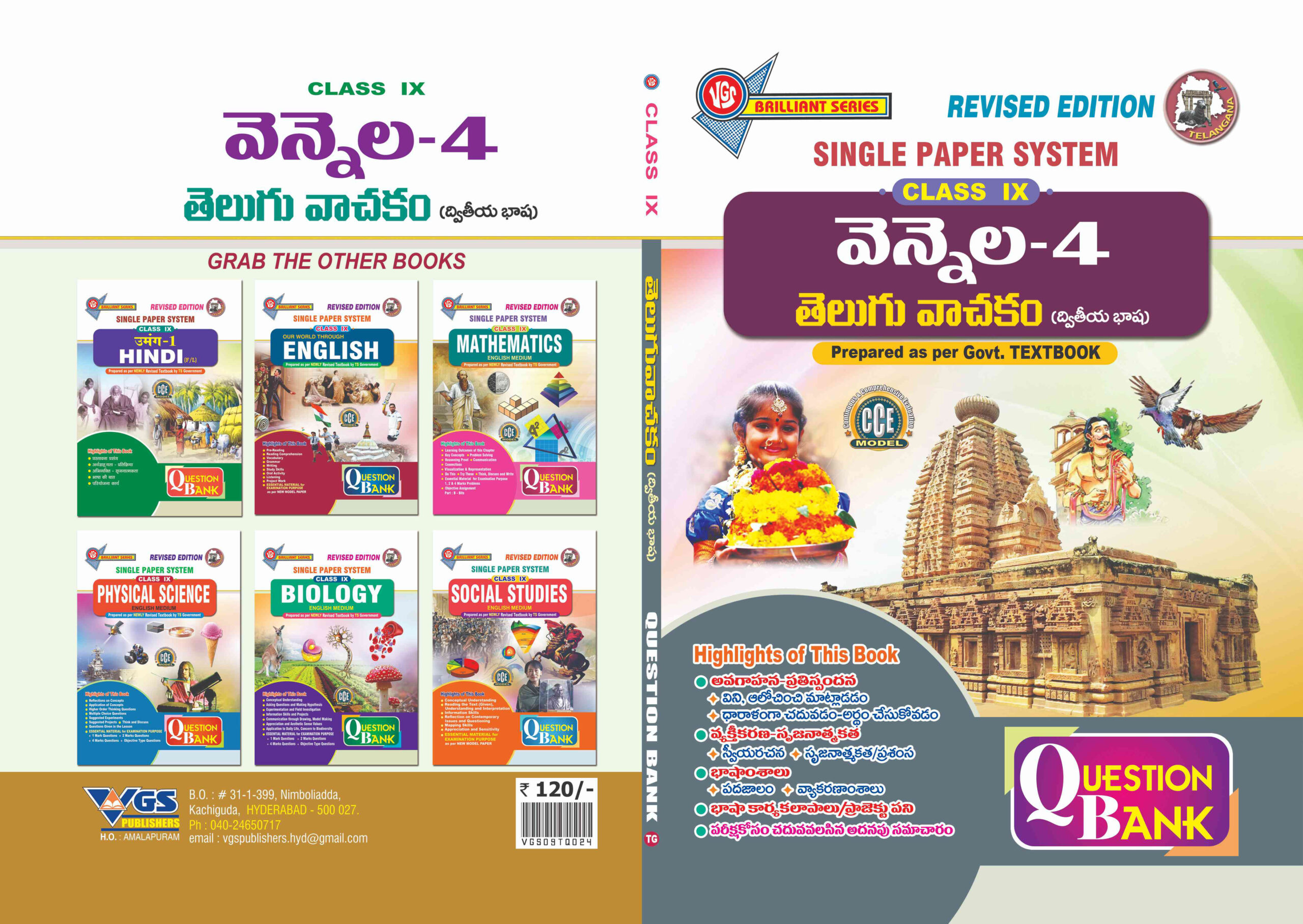 The TG 9th Class Telugu-Vennela-4( Second Language) Question Bank-2026 is a comprehensive and student-friendly resource designed as per the latest Telangana State Board syllabus and exam guidelines. This book provides chapter-wise coverage of all topics from Telugu-Vennela-4( Second Language), ensuring complete preparation for the Class 9th Class Telugu examination.
